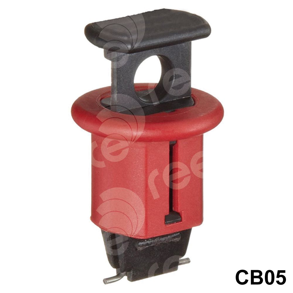![]() | CB05 Push button operated, the model CB05 locates into the 2 holes either side of the breaker switch (as shown in the illustration). Fits most popular breakers up to 60 Amp - Will also fit breakers connected with a cross bar. Locates prongs inside. | ![]() |