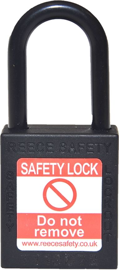 Nylon body safety padlocks supplied with non conductive nylon shackles. Comes complete with 1 key with the numbers engraved on to the body of the padlock and key. Keyed alike. Colour Black