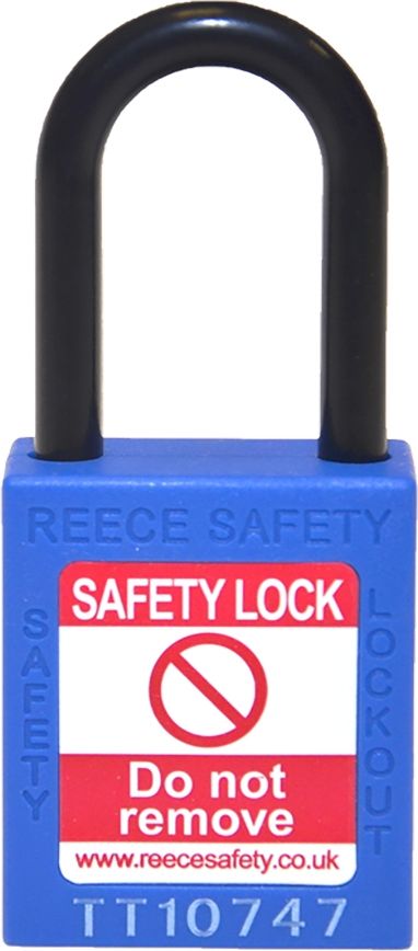 Nylon body safety padlocks supplied with non conductive nylon shackles. Comes complete with 1 key with the numbers engraved on to the body of the padlock and key. Keyed alike. Colour Blue